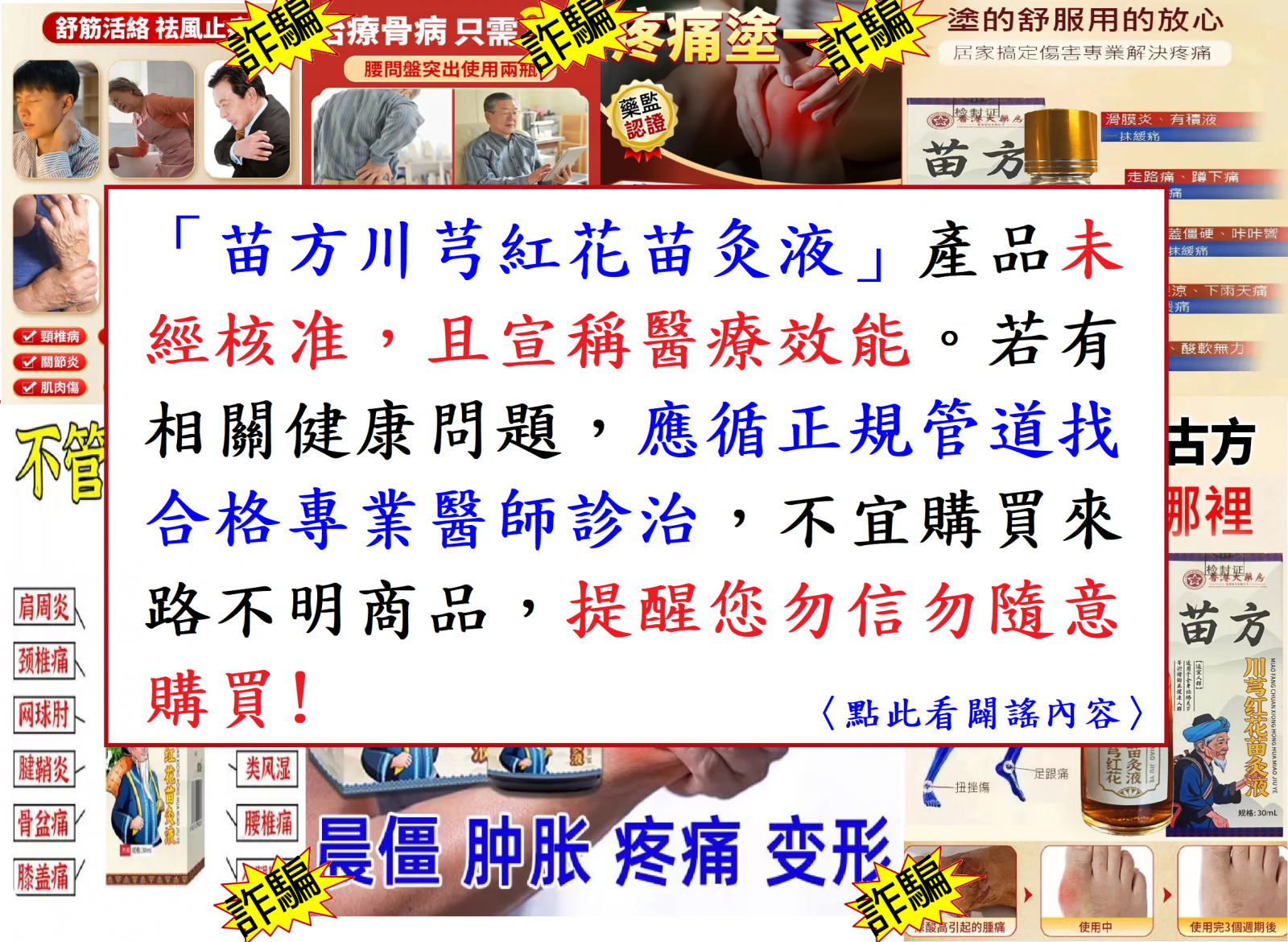 「苗方川芎紅花苗灸液」產品未經核准,且宣稱醫療效能,易誤導民眾